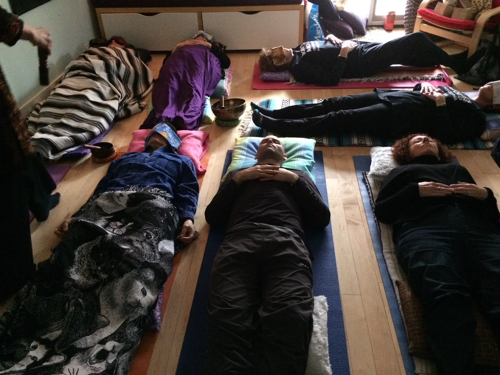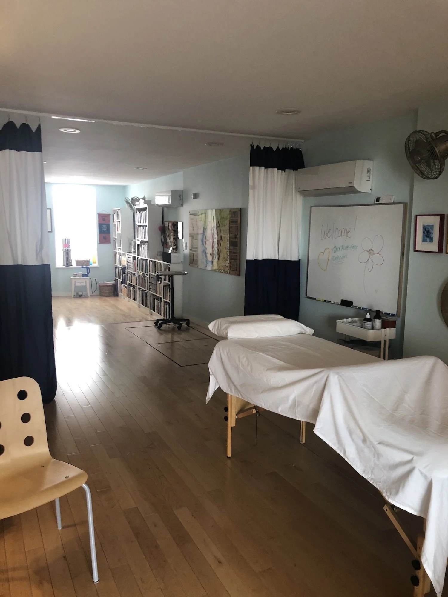 Back to Life Urban Sanctuary comfortably seats 10-30 people, depending upon your set up; 30 folks can sit comfortably if arranged in rows, 15-18 folks can sit in a circle, and 6-10 folks can spread out on yoga mats. We have folding chairs, back jacks, pillows, yoga blankets, yoga blocks, and a full bathroom, all available for your use.