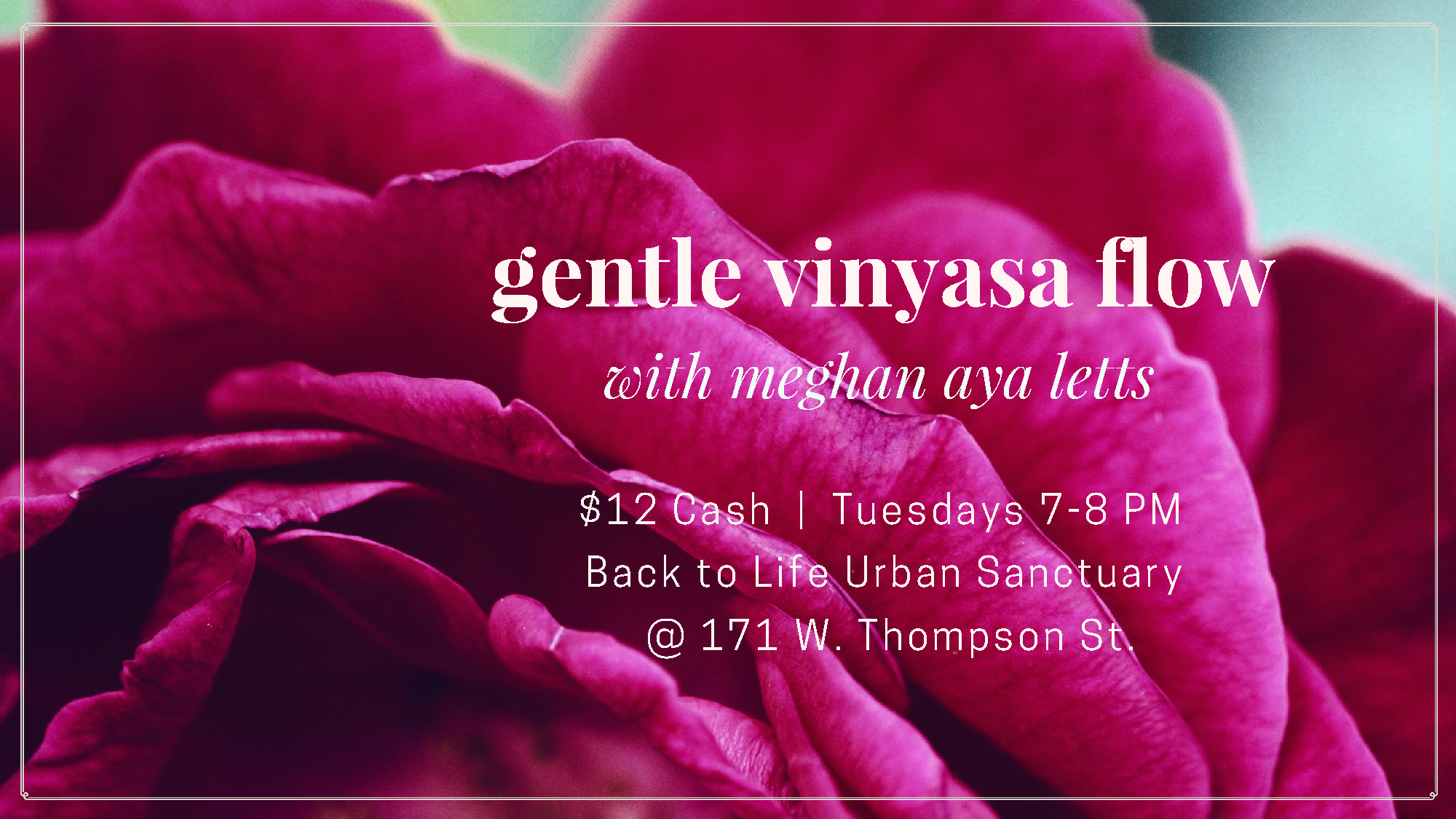 Join us for our very first Tuesday evening yoga class at the beautiful Back to Life Urban Sanctuary! Meghan Aya Letts will be teaching this Gentle Vinyasa Flow.